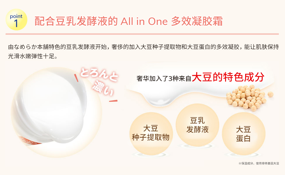 2. 含有大豆发酵液,大豆种子精华和大豆蛋白质成分,充分发挥补水保湿功能,用后肌肤感觉柔滑细嫩,紧致Q弹。